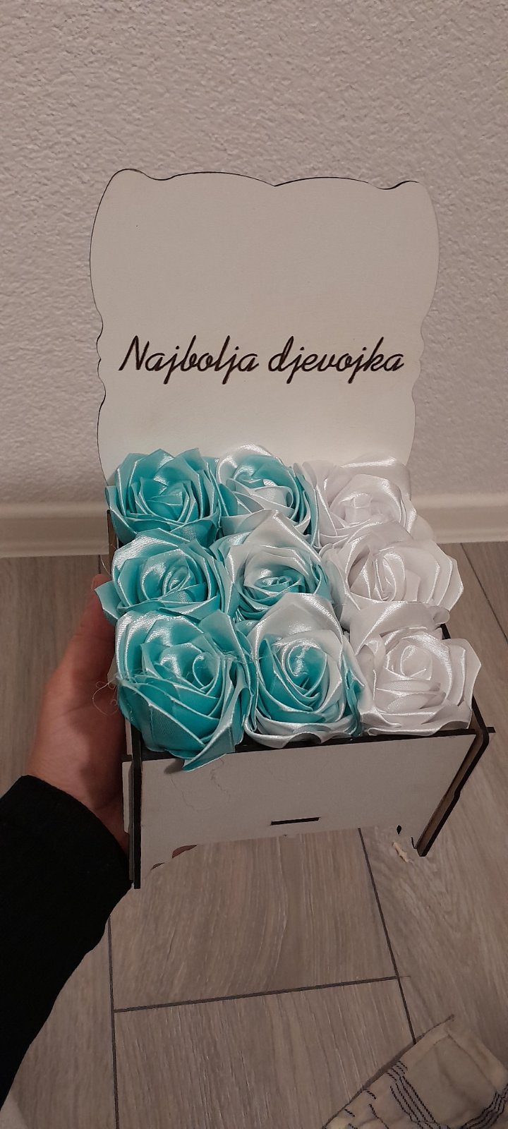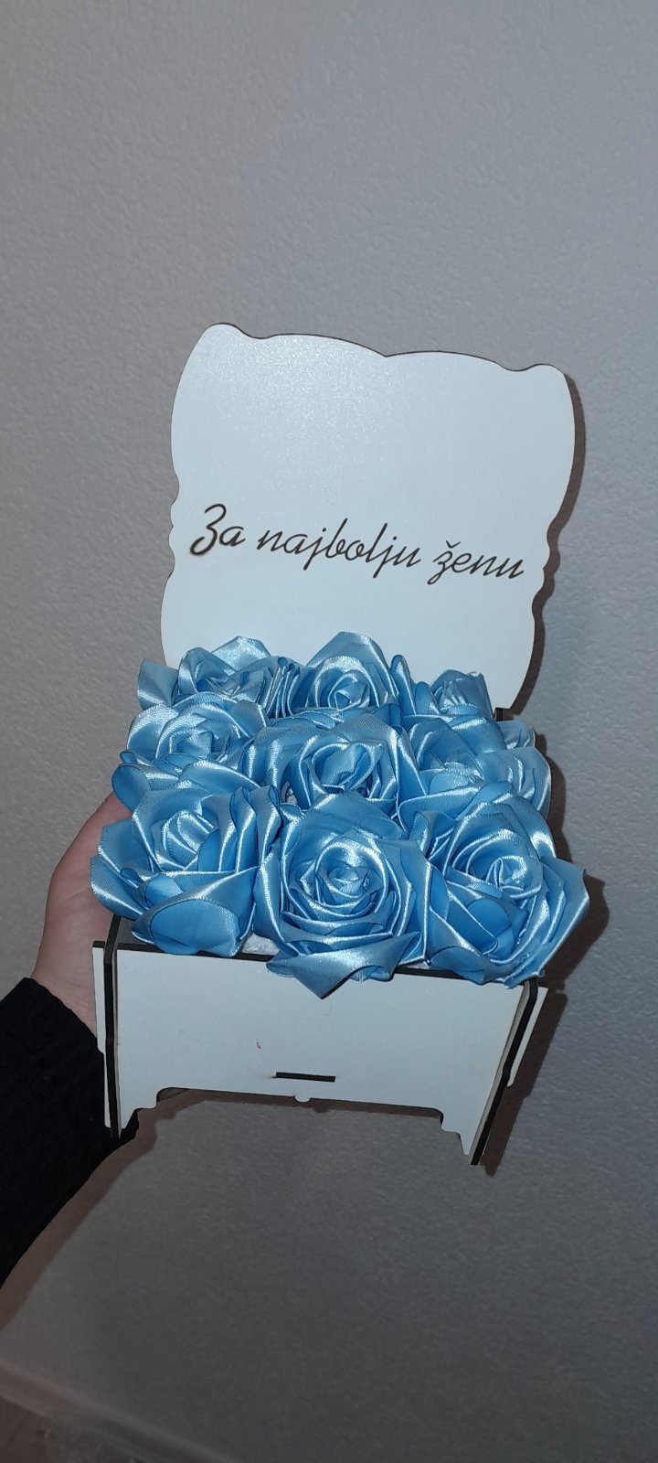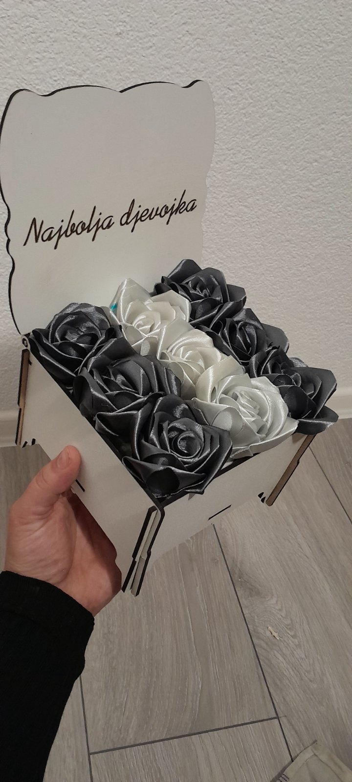 Personalizovana Kutija: Ruže su smještene u elegantni drveni sandučić (bijele boje) sa graviranom porukom.