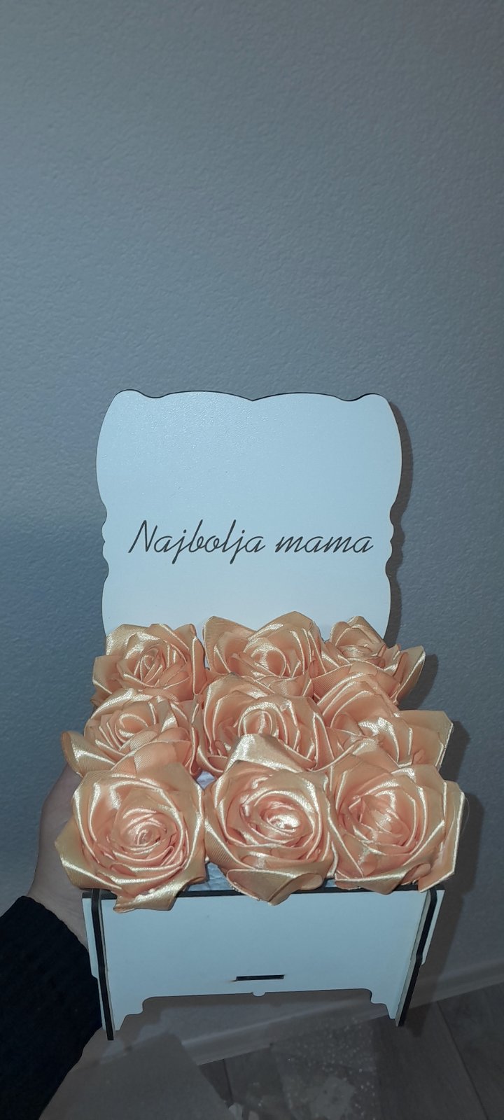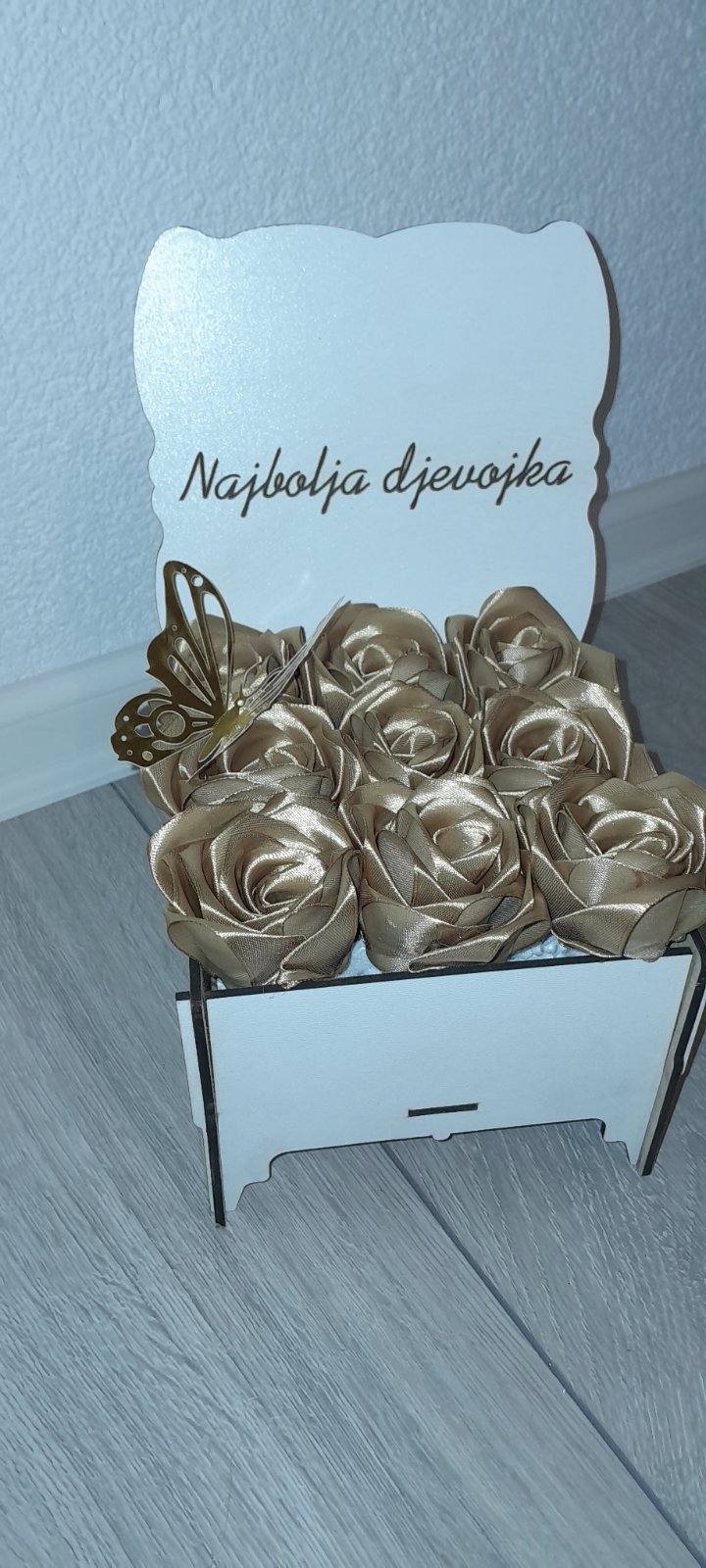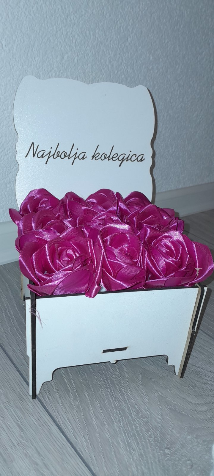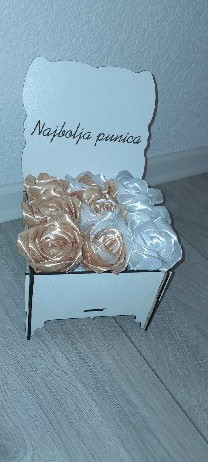 Personalizovana Kutija: Ruže su smještene u elegantni drveni sandučić (bijele boje) sa graviranom porukom.